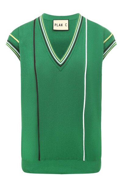 Зеленый жилет украсили узкими разноцветными полосами, с которыми зарифмовали графичные кант V-образного выреза и манжеты на проймах. Для создания модели использовали мягкий трикотаж, связанный из тонкого нежного хлопка. Дышащий материал из премиальных волокон получился легким и приятным на ощупь, поэтому изделие комфортно носить не только поверх водолазки или блузы, но и на голое тело.