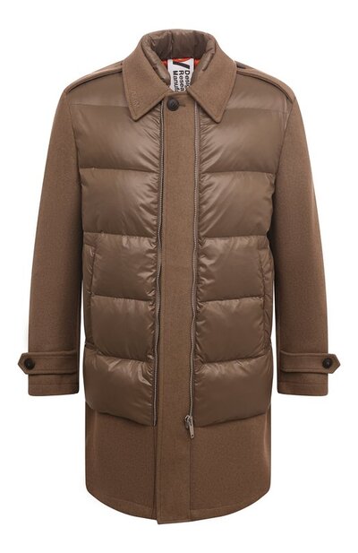 Широкие накладки, имитирующие стеганый жилет, не только снижают строгость бежевого пальто из плотной шерсти, но и помогают ему лучше сохранять тепло. Детали из нейлона наполнены гусиными пухом и пером, которые удерживают нагретый воздух внутри и формируют дополнительный барьер для холодного ветра. От ненастья защищают также внутренний утепленный воротник-стойка и штормовая планка над молнией.