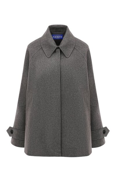 При создании серого пальто дизайнеры марки перенесли фокус на архитектурный силуэт. Чтобы ничто не отвлекало внимание, детали свели к минимуму: даже пуговицы скрыли под планкой, оставив лишь нарочито крупные паты и отложной воротник. Для пошива меланжевой модели выбрали плотную фактурную шерсть.