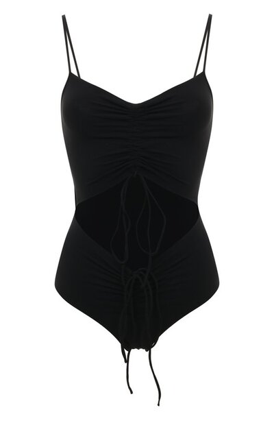 Для пошива черного слитного купальника мастера марки использовали легкий быстросохнущий текстиль. Материал хорошо тянется, но не растягивается, поэтому модель комфортно облегает тело, как вторая кожа. Размер фигурного выреза спереди удобно регулировать с помощью шнуров, продетых в кулиски на лифе и плавках.