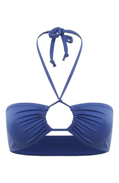 У синего бра-бандо нет застежки: ее заменяют парные кулиски спереди и монобретель-шнур. Конструкция формирует эффектный вырез, ширину которого можно регулировать, и позволяет носить завязки прямыми или перекрещенными. Для пошива модели использовали тонкий эластичный полиамид.
