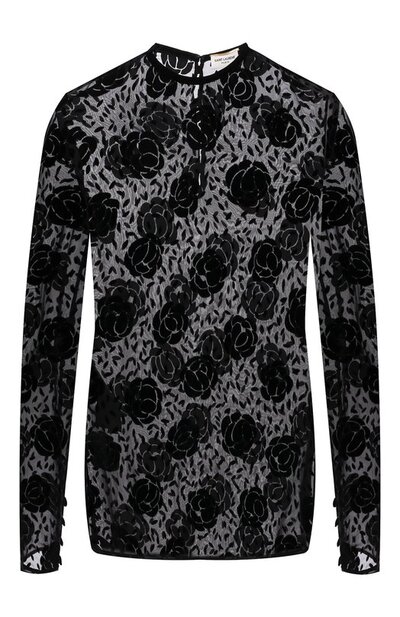 Полупрозрачный черный топ из шелковистого трикотажа с объемными бархатными розами может стать основой чувственного образа. Легкая эластичная модель с круглым вырезом и длинными рукавами вошла в осенне-зимнюю коллекцию марки, основанной Ивом Сен-Лораном. Нам нравится сочетать с брюками и туфлями в тон.