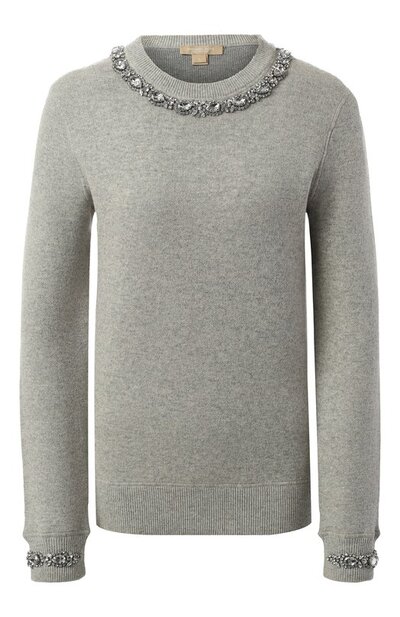 Отделка сверкающими кристаллами, напоминающая ожерелье и браслеты, вывела серый пуловер на новый уровень, переведя его из повседневной одежды в разряд must-have. Меланжевая модель с круглым вырезом выполнена из тонкого мягкого материала на основе кашемира. Майкл Корс включил вещь в осенне-зимнюю коллекцию 2018 года.