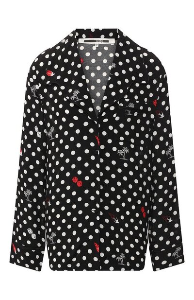 Свободная черная в белый горох блуза из легкой дышащей вискозы подойдет, чтобы отмечать очередной температурный рекорд. А контрастные изображения игральных костей, пальм и фирменной ласточки вносят разнообразие в лаконичный мотив. Модель с широким воротником вошла в весенне-летнюю коллекцию бренда, основанного Александром Маккуином.