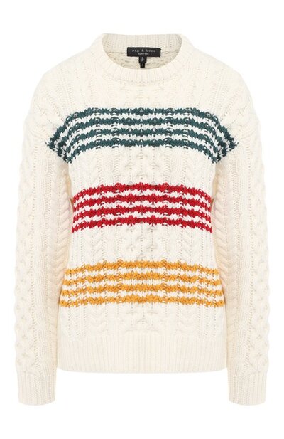 Для создания свитера из весенне-летней коллекции использовали мягкую шерстяную пряжу. Простой крой и пастельный кремовый оттенок модели дизайнеры компенсировали объемным узором и узкими поперечными полосами, выполненным нитями насыщенного зеленого, красного и желтого цветов. Комбинируя такую яркую вещь с другой одеждой, подбирайте остальные элементы в тон, чтобы сохранить целостность комплекта.