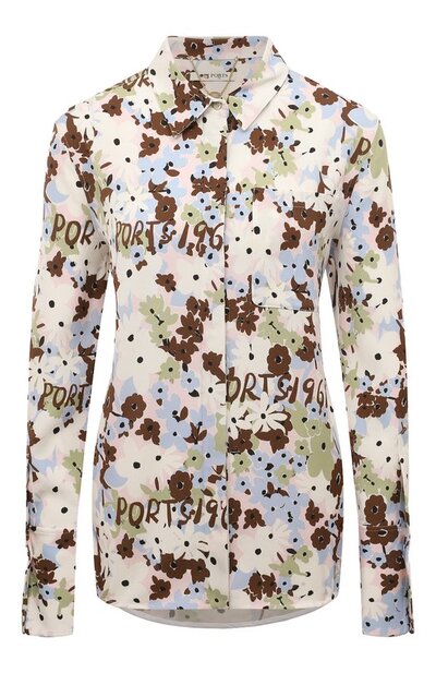 Разноцветная рубашка с бантовой складкой на спинке сшита из дышащей шелковистой вискозы стрейч с красочным цветочным мотивом, сочетающимся с логотипами марки. Легкая модель с отложным воротником и длинными рукавами дополнена накладным нагрудным карманом. Наши стилисты предлагают создать образ с голубыми джинсами, светло-зеленой сумкой и белыми туфлями.