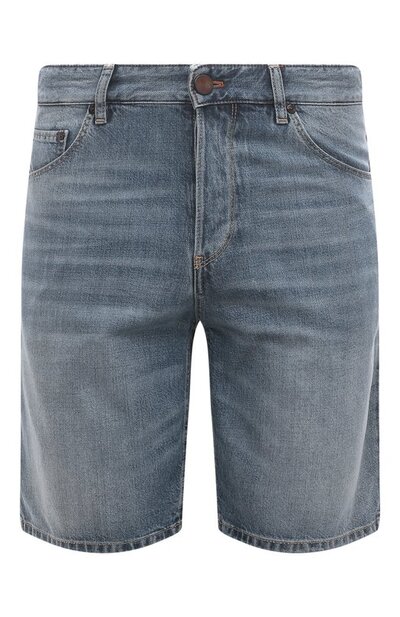 Для пошива синих джинсовых шортов прямого кроя мастера марки использовали мягкий материал на основе хлопка. Чтобы адаптировать модель для более теплой погоды, ткань облегчили, добавив в состав дышащие волокна лиоцелла. Деликатные заломы и потертости придают изделию вид вещи с историей.