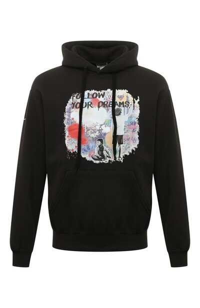 Для пошива черного худи мастера марки использовали плотный трикотаж, который хорошо сохраняет тепло тела. Спереди на модели разноцветными красками изобразили рисунок и сопроводили его вдохновляющей надписью Follow your dreams. Такое изделие немного разнообразит повседневный комплект с джинсами и кедами.