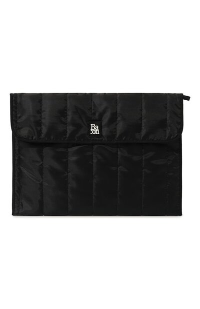 Для пошива черного прямоугольного клатча использовали шелковистый плотный материал со стеганым узором в виде широких полос. Откидной клапан, закрывающийся кнопкой, украсили небольшим патчем с белым логотипом бренда. В аксессуар поместятся документы формата А4 и телефон.