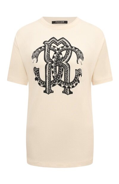 Роль декора на этой футболке кремового цвета играет черная монограмма RC из инициалов Роберто Кавалли, похожая на змеиный клубок. Для пошива модели с небольшим логотипом под горловиной сзади использовали мягкое дышащее джерси, связанное из премиального хлопка.