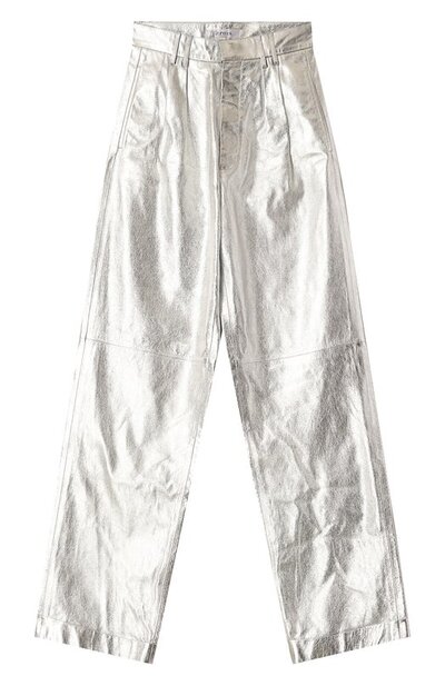 Широкие серебристые брюки из осенне-зимней коллекции 2018 года завершат образ для вечеринки, если сочетать их с топом и аксессуарами, а со строгой черной блузой подойдут для торжественного приема. Для создания модели с отворотами Жан-Клод Житруа выбрал мягкую металлизированную кожу. Изделие с четырьмя карманами дополнено защипами, поэтому комфортно садится на талии.