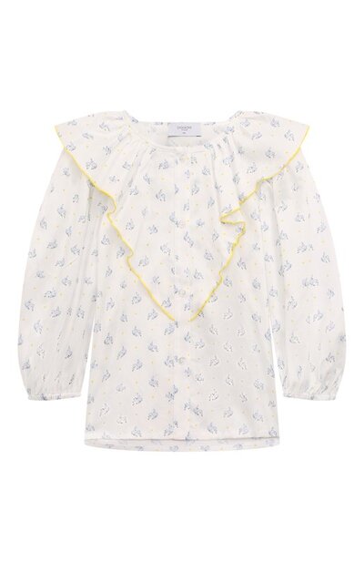 Молочно-белую блузу сшили из тонкой приятной на ощупь ткани из отборного хлопка, выращенного экологичным способом. Материал хорошо пропускает воздух, сохраняя комфорт даже в зной. Романтичность, заданную нежным цветочным мотивом в голубых тонах, поддержали объемными рукавами 3/4 и широкой оборкой с узким желтым кантом, заменяющей воротник.