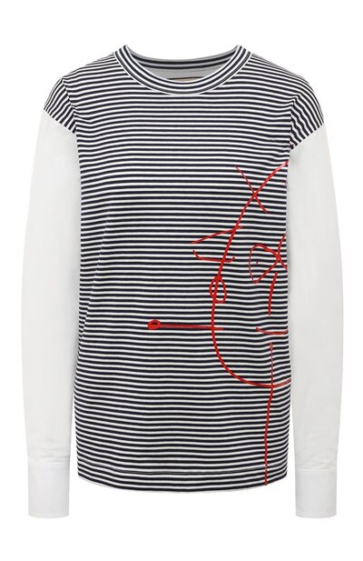 При создании свободного топа дизайнер марки миксовала детали свитшота и рубашки. От первого модель получила круглую горловину и полосатую трикотажную вставку, а от второй — длинные рукава и заднюю часть из однотонного хлопкового поплина. Сбоку есть ярко-красный принт, напоминающий детский рисунок.