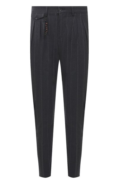 Зауженные синие брюки в узкую меловую полоску сшили из мягкой ткани на основе отборной тонкой шерсти с гладкими волокнами. В состав материала добавили легкий кашемир и прочный шелк, поэтому она получилась особенно приятной на ощупь и долго не теряет безупречный вид. Чтобы сделать посадку по фигуре комфортнее, спереди предусмотрели неглубокие складки. В комплекте – фирменный брелок с маской Пульчинеллы.