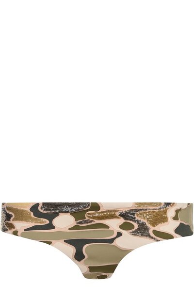 Мастера марки сшили зеленые плавки-бикини с заниженной линией талии из эластичной быстросохнущей ткани. Материал комфортно облегает фигуру, пропускает воздух и не выгорает на солнце. Модель расшита пайетками и украшена аппликациями, формирующими камуфляжный узор.