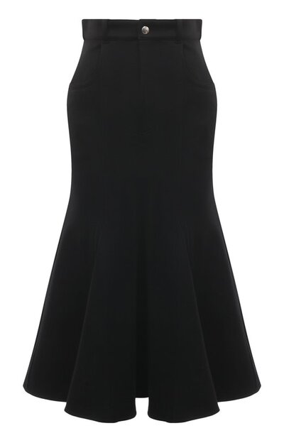 Черную юбку годе из плотного микса хлопка и нейлона оставили без акцентов, сместив фокус на силуэт с характерными крупными складками внизу. Романтичному низу противопоставили верх с карманами и застежкой-молнией, крой которого напоминает джинсовые модели.