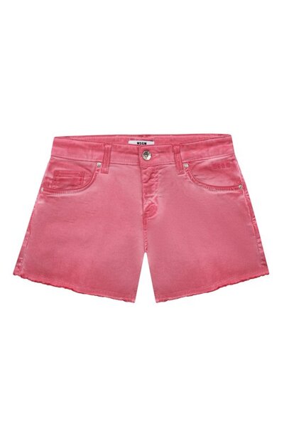 Шорты оттенка фуксии окрасили в готовом виде, сформировав на поверхности уникальные полутона и эффект выгоревшей на солнце вещи. Для пошива модели с короткой бахромой на необработанном низе использовали мягкий, в меру плотный деним, который не препятствует циркуляции воздуха и не натирает нежную кожу.