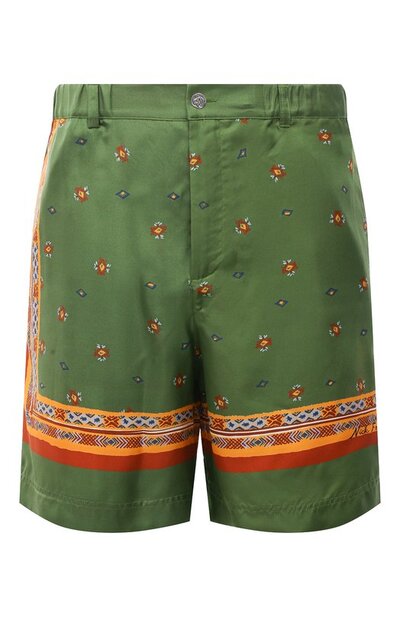 Свободные зеленые шорты в пижамном стиле декорировали ярким принтом, вдохновленным мотивами на платках паше. Для пошива модели мастера марки использовали мягкий шелковый твил с деликатным блеском. Чтобы изделие комфортнее садилось на талии, пояс дополнили эластичной вставкой.