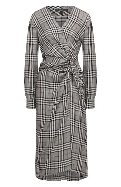 Несмотря на черно-белую клетку это платье-рубашка из вискозы не выглядит строго. Сдержанный мотив уравновесили небрежным узлом на талии, который сформировал мягкую драпировку, а глубокое V-образное декольте зарифмовали с высоким разрезом спереди. Повторить образ с показа осенне-зимней коллекции помогут сапоги с таким же принтом, а наши стилисты предлагают заменить их на босоножки.
