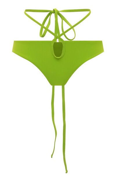 Плавки-бикини насыщенного зеленого оттенка не выглядят как традиционная модель. Все дело в фирменном фигурном вырезе спереди, кант на котором переходит в длинные завязки. Для пошива изделия использовали мягкий эластичный текстиль, который быстро сохнет и не выгорает на солнце.
