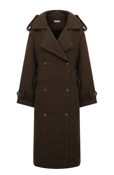 Плотная коричневая полушерсть в мелкую клетку пье-де-пуль задает тон этому двубортному пальто, но не делает его предельно строгим. Градус формальности снижают увеличенные пропорции и эластичная вставка сзади, превращающая свободный силуэт в приталенный. Деталь выполнена из той же блестящей кожи, которой обтянуты крупные погоны на спущенных плечах и регулируемые паты на рукавах.