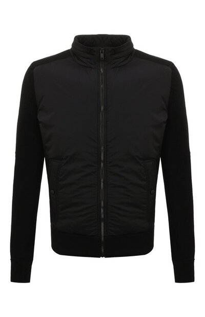 Дизайнеры марки выбрали для изготовления черной толстовки мягкий хлопковый трикотаж. Ему противопоставили гладкий текстиль, из которого выполнили утепленную вставку спереди и капюшон. Этот материал изготовили из переработанного вторсырья, сэкономив ресурсы и снизив объемы выбросов. Рукава со стороны локтей дополнили фактурными накладками, создающими сходство с экипировкой байкеров.