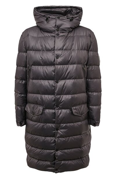 Для пошива удлиненной серой куртки мастера марки использовали шелковистый полиэстер, который не продувается ветром. Чтобы обеспечить дополнительный комфорт в непогоду, модель дополнили регулируемым глубоким капюшоном, объединенным с воротником. Изделие утеплили гусиным пухом, который не утяжеляет вещь.