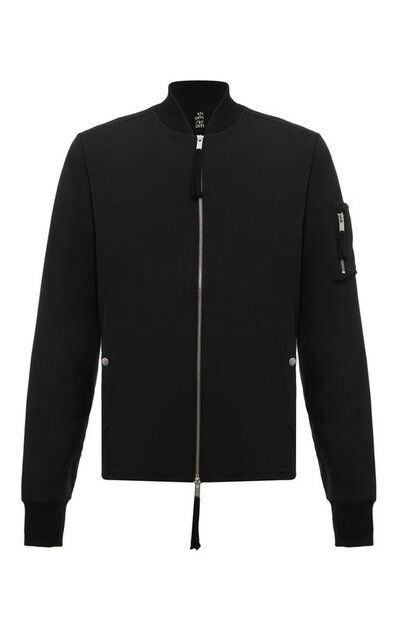 Для пошива черного бомбера с отделкой из рифленого хлопкового трикотажа использовали эластичный матовый нейлон. Легкий материал не промокает, не продувается ветром, быстро сохнет и не требует особенного ухода, поэтому куртка идеально подойдет для капризного межсезонья. Модель с манжетами-митенками дополнили карманами по бокам и на левом рукаве.