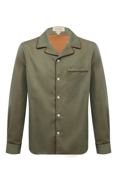 Для изготовления зеленой рубашки в пижамном стиле мастера марки использовали мягкий хлопок с шевронным узором. Длинные гладкие отборные волокна придали полотну шелковистый блеск и игру полутонов. Модель с коричневым узким кантом дополнили одним накладным карманом на груди.