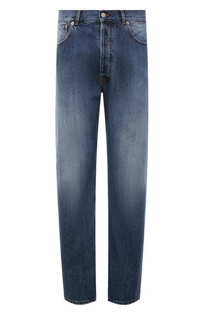 Синие джинсы с завышенной посадкой могли выглядеть просто, если бы не декор. Потертости, заломы и выбеленный эффект поддержали черной абстрактной вышивкой, которую расположили под коленями сзади. Брюки сшили из мягкого денима средней плотности, поэтому в них будет комфортно как в теплую, так и прохладную погоду.