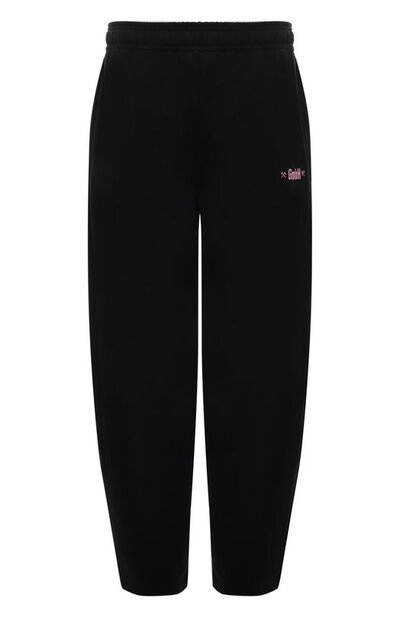 Черные свободные брюки максимально комфортно садятся по фигуре, не стесняя движения. За удобную посадку отвечают также заниженная линия шага и широкий эластичный пояс. Для пошива модели мастера марки использовали мягкий хлопковый трикотаж. Принадлежность изделия бренду обозначили розовым вышитым логотипом спереди.