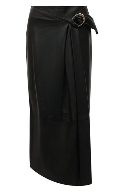 В весенне-летнюю коллекцию вошла черная юбка из матовой мелкозернистой кожи. За счет бережной выделки материал получился легким, поэтому он мягко струится в складках, ниспадающих от драпировки спереди. Она в тандеме с фигурной металлической пряжкой делает деликатный акцент на талии. Наши стилисты предлагают не скрывать декоративный прием, а, наоборот, подчеркнуть, заправив внутрь контрастную блузу.