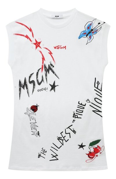 Белое платье с круглым вырезом стилизовали под футболку без рукавов. Сходство усилили материалом. Мягкое тонкое джерси связали из премиального хлопка, который хорошо пропускает воздух и быстро впитывает влагу. Ярче модель сделал принт, напоминающий детские рисунки, словно выполненные разноцветными маркерами.