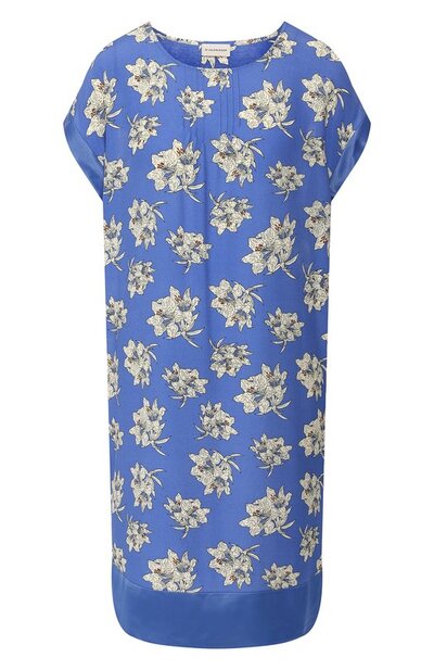 Синее платье свободного силуэта, с декоративными швами на лифе выполнено из тонкого вискозного крепа с белыми лилиями. На коротких рукавах и подоле — однотонные атласные оборки. Модель вошла в весенне-летнюю коллекцию бренда, основанного Малене Биргер.