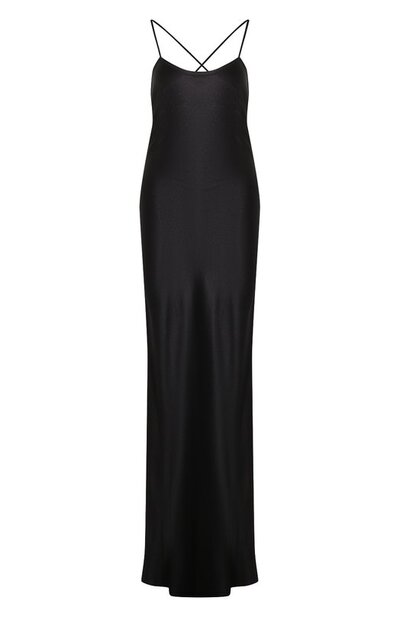 Черное длинное платье станет идеальным решением для вечерних образов. Полуоблегающую модель с глубоким декольте сшили из гладкого шелкового атласа с легким блеском, который деликатно подчеркивает изгибы силуэта. Открытую спину акцентировали перекрещивающимися узкими бретелями.