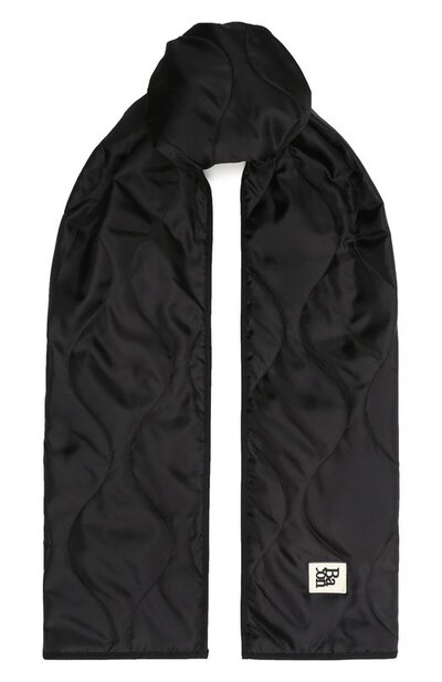 Для создания черного шарфа с фактурным стеганым узором использовали мягкий шелковистый полиэстер с характерным блеском. Материал приятно ощущается на коже, легко драпируется и долго не теряет форму. Принадлежность марке подчеркнули небольшой контрастной нашивкой с логотипом.