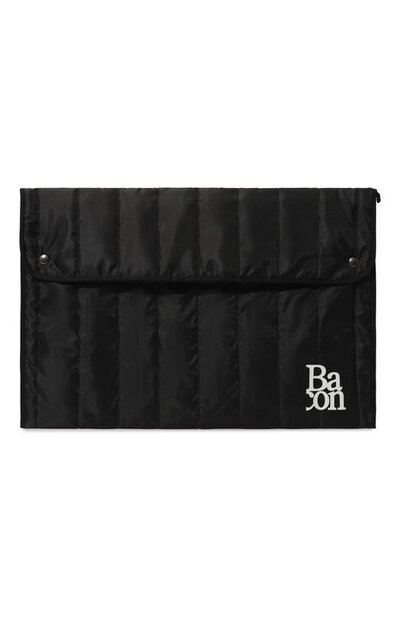 Этот клатч можно не только носить сам по себе, но и превратить в дополнительное отделение сумки-шопера. Аксессуар с застежкой на кнопки вместит в себя бумаги А4 или ноутбук с экраном 15,6 дюйма, а водонепроницаемый стеганый текстиль защитит содержимое от повреждений. Единственным декором лаконичной модели стал контрастный логотип на передней панели.