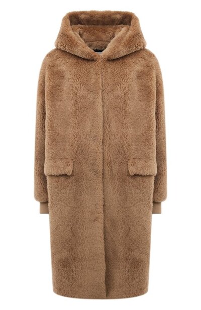 Для пошива бежевой шубы с потайной застежкой на кнопки использовали мягкий шерстяной текстиль, напоминающий мех с коротким шелковистым ворсом. Изделие утеплили тонким слоем наполнителя, который сохраняет комфортный микроклимат. Капюшон дополнительно защищает голову и шею от ветра, а эластичные манжеты не пропускают холод внутрь.