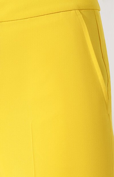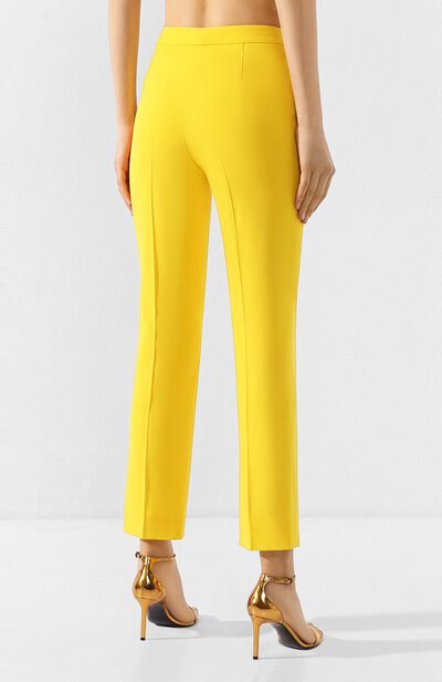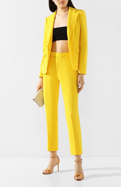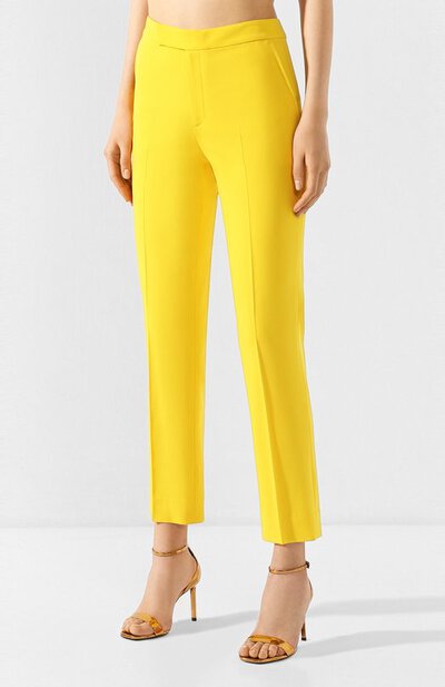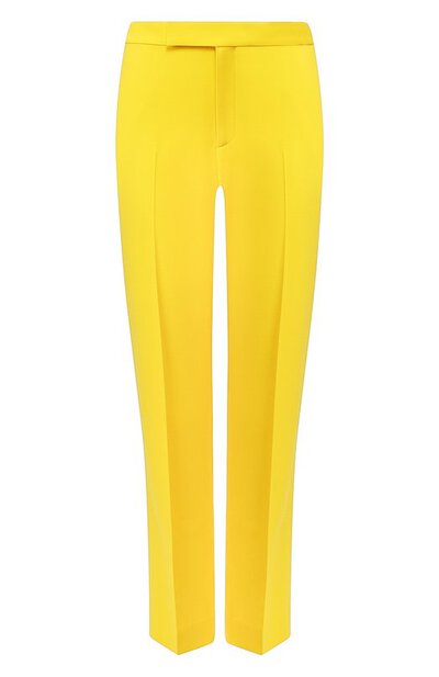 Ральф Лорен включил в весенне-летнюю коллекцию брюки насыщенного желтого цвета (такой оттенок бодрит не хуже, чем цитрусовый фрэш). Укороченную модель со стрелками изготовили из тонкого шерстяного крепа. При создании ткани нити скрутили особенно плотно, поэтому она получилась легкой, и при этом хорошо держит форму.