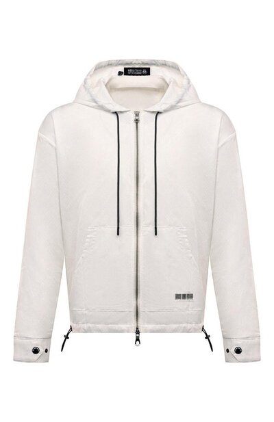 Для изготовления толстовки с фирменным штрих-кодом на кармане «кенгуру» использовали хлопковый футер и нейлон. Модель, застегивающуюся на встречную молнию, декорировали вышитой надписью сзади. Изделие с кнопками на манжетах и регулируемой кулиской по низу завершит повседневный образ с брюками и кедами.