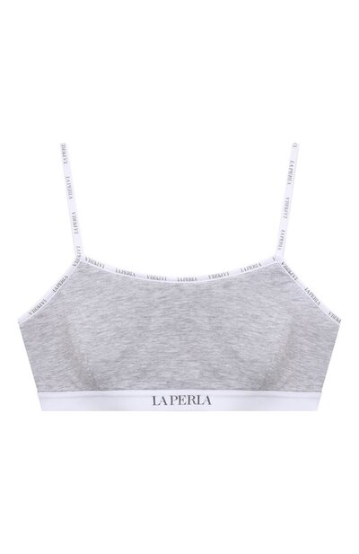 Крупный логотип марки подчеркивает широкий эластичный пояс этого бра. Миниатюрная версия фирменной символики складывается в мотив на узких бретелях и кантах, очерчивающих линию верха. Детали в оттенках черного и белого контрастируют с серым трикотажем из мягкого хлопка стрейч.