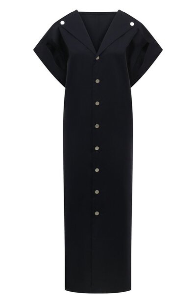 Для пошива темно-синего платья с короткими свободными рукавами использовали плотный и при этом легкий хлопок. Роль акцента отдали серебристым круглым пуговицам, которыми украсили плечи и завышенную линию талии. Изделие можно носить как планкой-застежкой спереди, так и сзади.