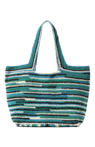 Голубую сумку Suki мастера марки связали вручную крючком, используя мягкую прочную пряжу нескольких оттенков. Ее скомбинировали так, чтобы получился горизонтальный узор в виде асимметричных полос. В модель с двумя удлиненными ручками поместятся журнал формата А4, футляр с очками, кошелек и телефон.