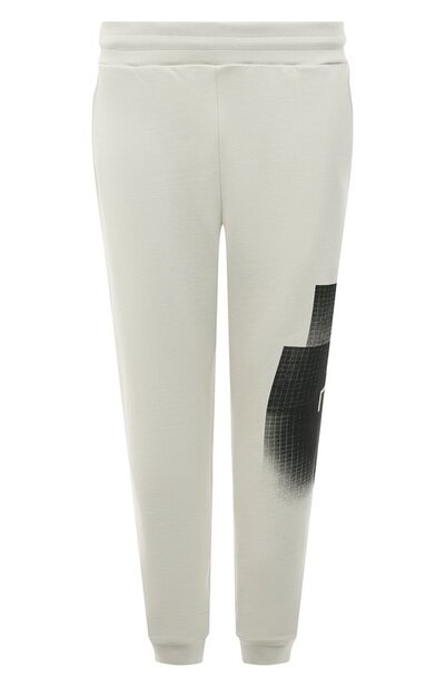 Принт в виде черной миллиметровой бумаги оттеняет кремовый цвет этих джоггеров из мягкого хлопкового трикотажа. С графичными линиями нарочито потертого рисунка рифмуется крупная эмблема бренда в виде скобы, дополненная фирменной аббревиатурой. Символика марки украшает и небольшой черный патч с заклепками на левом боковом кармане.