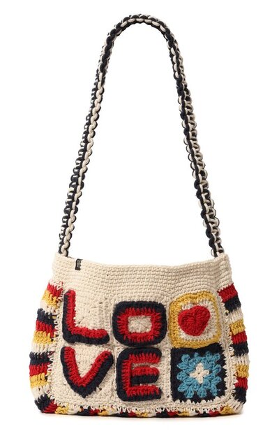 Название сумки Love дизайнеры бренда вписали в крупный вязаный узор с изображением сердца, которым модель украсили с обеих сторон. Для изготовления аксессуара использовали мягкую прочную пряжу. Фактуру поддержали плетеным плечевым ремнем, выполненным из текстильных шнуров двух оттенков. В изделие поместятся футляр с очками, ключи, кошелек и телефон.