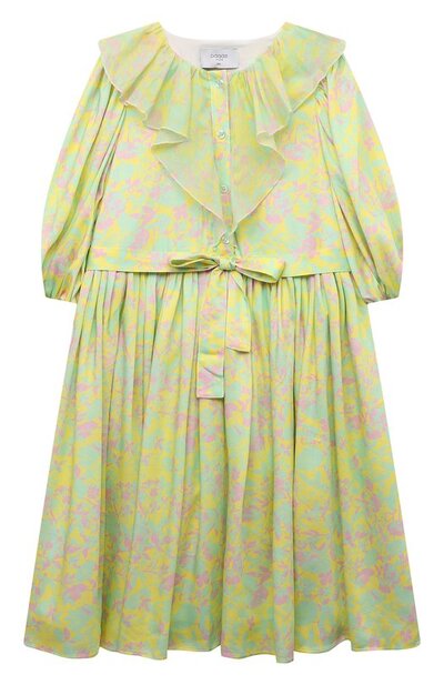 Светло-зеленое платье в исполнении латвийских дизайнеров получилось романтичным. Воздушность модели придают пышные рюши, расклешенный подол, широкие рукава с эластичными манжетами и длинный пояс. Изделие, застегивающееся на пуговицы спереди, выполнено из украшенной авторским цветочным узором струящейся ткани из шелковистой тонкой вискозы, которая сохраняет оптимальный микроклимат на весь день.