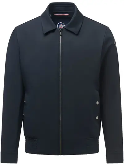 navy blue front zip fastening two side welt pockets appliqué logo elasticated hem