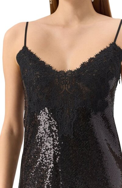 Платье на регулируемых бретелях выполнили из полиэстера, расшитого пайетками. Модель с кружевными вставками на глубоком декольте, полуоткрытой спине и внизу застегивается потайной молнией сбоку.