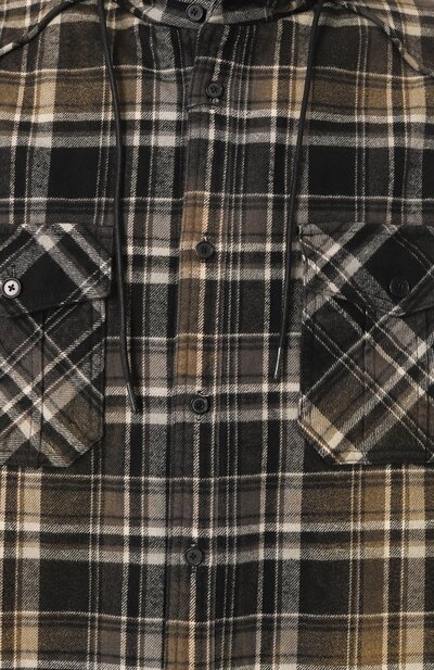 Клетчатую рубашку силуэта oversize сшили из хлопковой фланели. Модель с прямоугольными манжетами, боковыми и нагрудными карманами дополнили трикотажным регулируемым капюшоном.