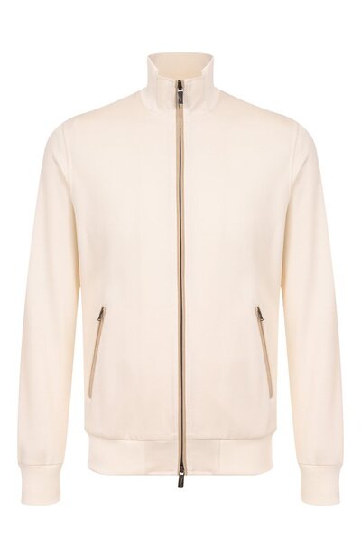 Толстовку с воротником-стойкой сшили из мягкого хлопкового трикотажа с добавлением полиэстера. Модель с двумя врезными карманами на молниях украсили сзади миниатюрной брендированной пластиной.